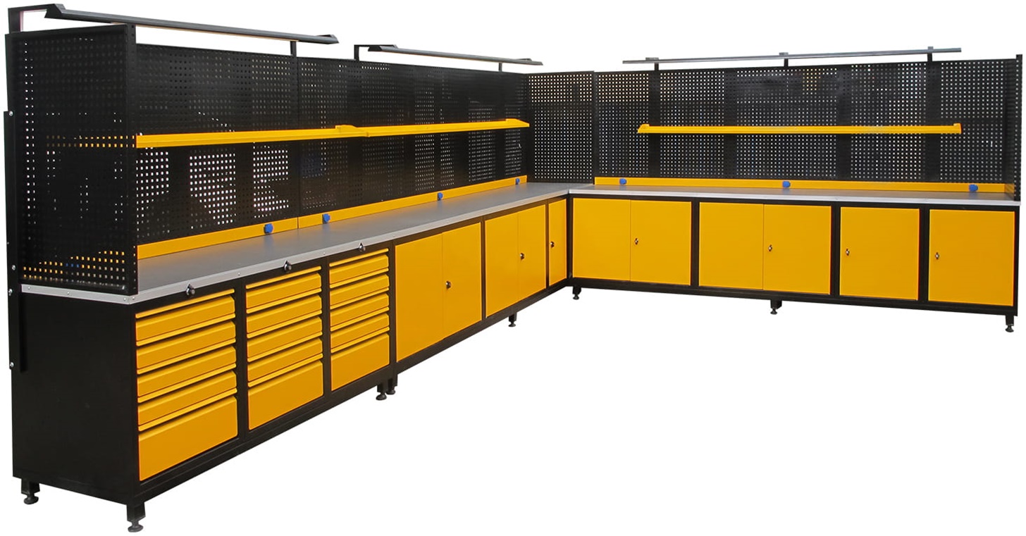 L Köşe Çalışma Tezgahı, 15 Çekmeceli, Aydınlatmalı, 8 Prizli